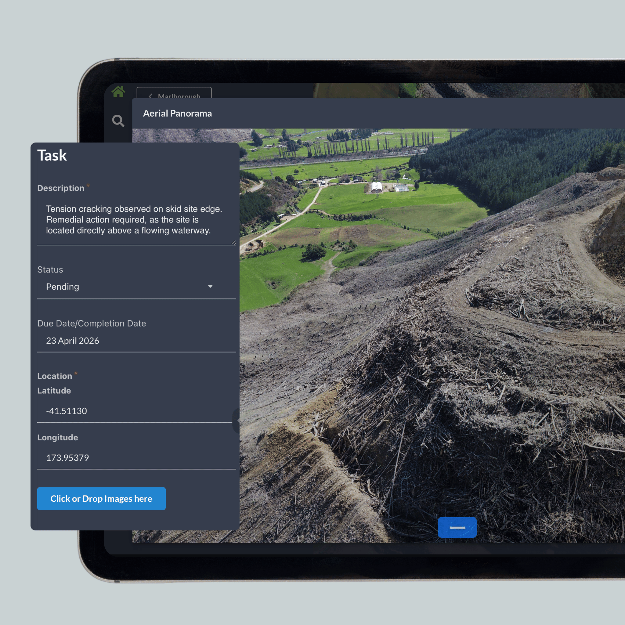 Upload drone and panoramic imagery to identify slash and evaluate the risk of it entering waterways.